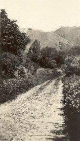 Small B&W photo shows a tree and foliage-lined road leading up the hillside. This is what will become Belvedere St. in Stinson Beach.Collection