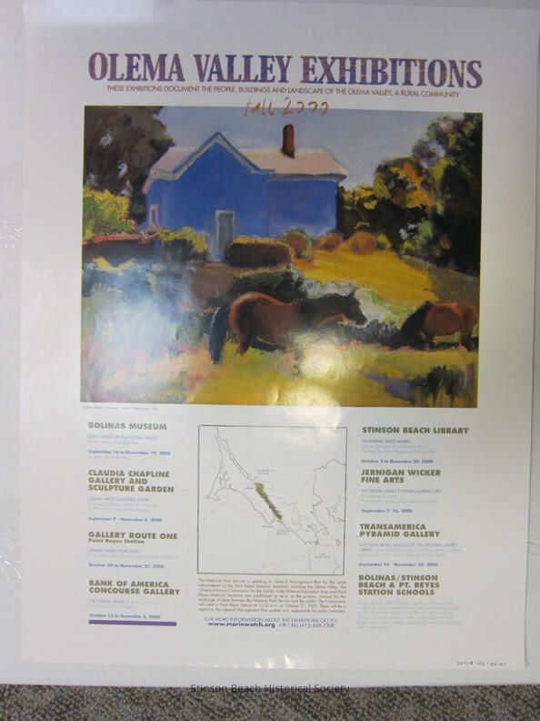 A poster made for the Olema Valley Exhibitions held in fall 2000. It is printed on both side of a paper. Illustration on the poster front is the reproduction of local painter, Dana Hooper. The front one is titled "Teixeira Ranch" and shows a blue house and two horses in the field dated 1999. The back has the same blue house and another painting called, "On the Road" by Hiram Bloomer dated circa 1880. The exhibitions were held in various venues in West Matin and in San Francisco documented the past and present landscape of the Olema Valley, Bolinas Lagoon to Tamales Bay, ranches and of the adjacent communities that have supported them generations. Included are paintings, photographs, group installations,Collection