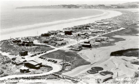This black and white photograph is a view looking down on the northern part of Bolinas Bay. Bolinas ridge is at the top of the picture with the (as yet undeveloped) sand spit in the upper right hand corner. The shore stretches diagonally across the picture to the lower left hand corner. The patio streets and houses are in the middle of the picture with the access road (Calle del Arroyo) going straight to the end of developement. Behind the road, in the lower right hand corner is the south end of the Bolinas lagoon, which at that time was not silted in but had water at high tide. See also 1993-456Collection