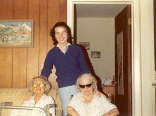 A color photograph of Agnes Bourne and Lollie Landerbe, sisters (twin?) lived behind Village Green I, across from the Parkside, with their caretaker, Kate from Ireland. The photograph appears to be taken inside the living room of their home in front of a doorway leading into a bedroom. Agnes is sitting on a yellow couch with her walker placed in front of her. Lollie in a wheelchair. Kate stands behind the two sisters. A framed painting of a local scene is on the wall behind them. Lollie is wearing a dark eyglass. Both are wearing whitish blouses. On the back, it is written in pen, "Agnes & Lollie, photo May 28, 1981, Kate from Ireland."Collection