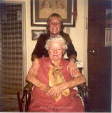 A color Polaroid photo of Lollie Landerbe in red dress sitting on her wheel chair and her caretaker, Katie Moritz. On their back is a wall with wall heater and 3 framed photographs. The largest could be a photograph of two sisters, Lollie and Agnes, when they were 5 or 6 years old. Next to the wall is a door with a calender hanging. On the back of the photo, written in pen, Lollie Landerbe + Katie Moritz '81.Collection