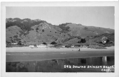 A black and white digital photo of a postcard of Sea Downs taken from the surf. Shows the hills of the Stinson in Back, the Sea Downs complex setting on the beach, beach and wet sand reflecting the hills. It is written on the lower light, Sea Downs Stinson Beach Calif.Collection