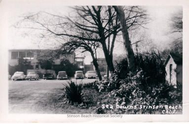 A black and white photograph of a postcard of Sea Downs taken from the parking lot side. It shows the 2 story structure with 7 cars parked in front. Alder trees and some willows to right and a cottage which was also rented by Sea Downs. It is written on the lower right corner, Sea Downs Stinson Beach, Calif.Collection