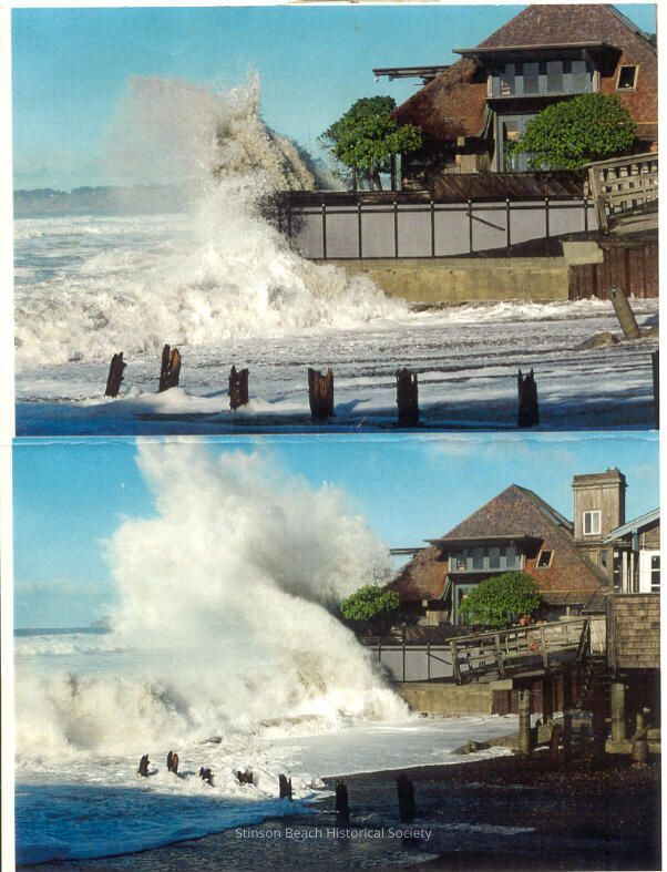 A color digital copy of 2 photos printed on one page and sent as a note. The photos show Bob Evan's house at the ocean front of Calle del Sierra being pounded by waves in winter of 1998, and the neighbor's deck caving in. The sky is blue and part of the Bolinas can be seen in distance. It was posted May 10, 1998 by Bob Evans to Val Agnoli. The note on the back reads, Val - as a fellow wave watcher- I thought you would enjoy my neighbors pictures - shot while I was cowering over the hill in Corte Madera - Let's hope the worst is over. Addressed to Val Agnoli PO Box Stinson Beach 94970.Collection