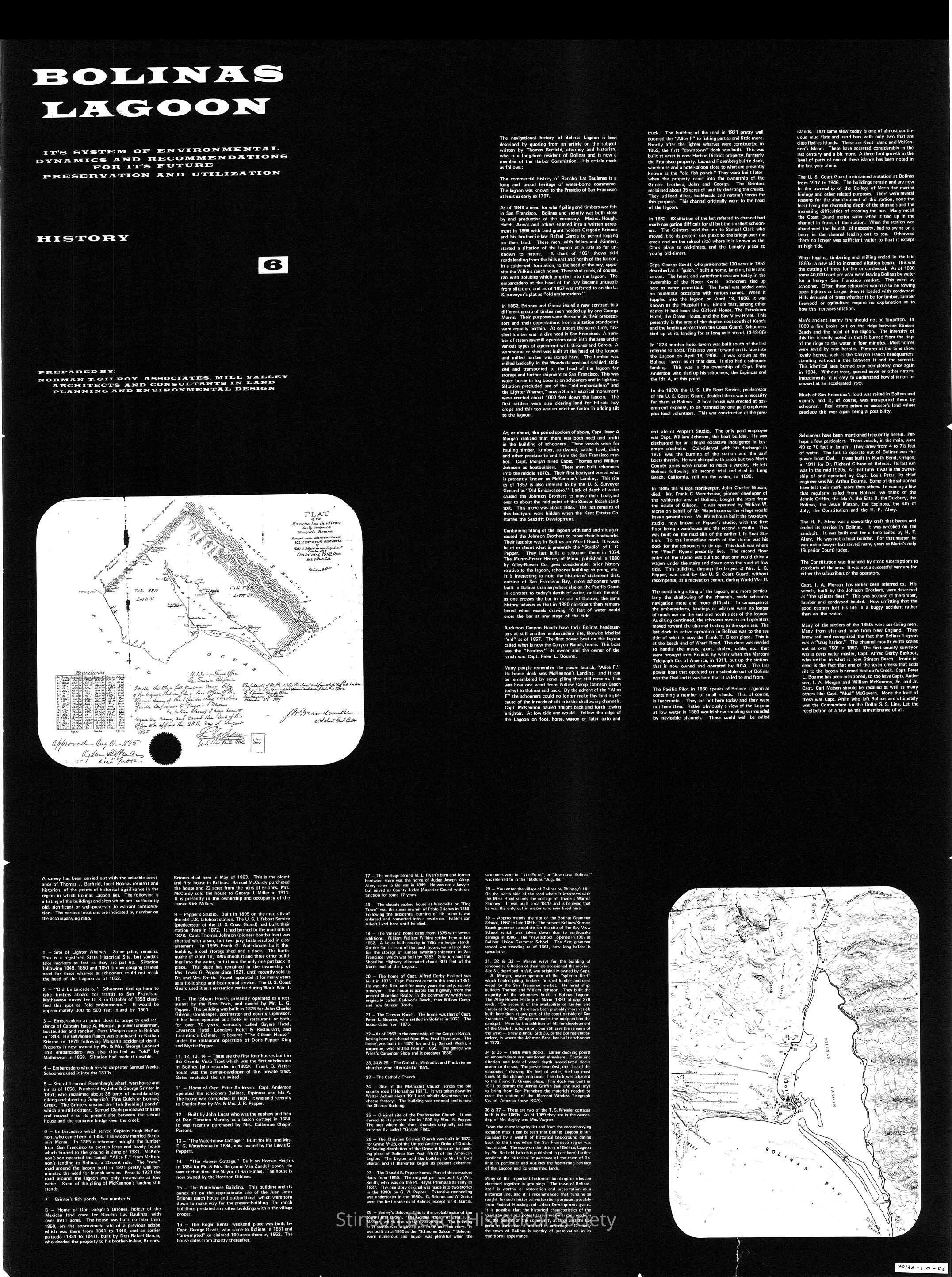 Along with a brief commercial history of the Lagoon and notable personages, a list of buildings and sites of historical significance in the Bolinas Lagoon region worthy of preservation, as compiled by historian Thomas J. Barfield, are located by number on accompanying maps.