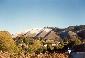 This color photograph shows trees and shrubbery surrounding some houses above which are hills with a dusting of snow. The houses are in the town of Stinson Beach and the hills with snow are part of the ridge behind the town.Collection
