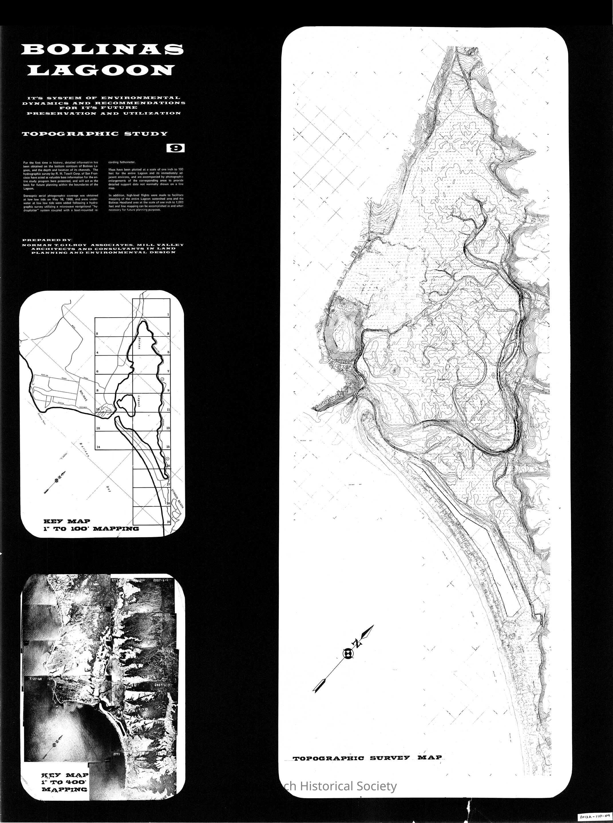 Hydrographic Survey by R. M. Towill Corp of San Francisco of the entire bottom of Bolinas Lagoon and environs, and includes aerial mapping of the watershed and headlands area.