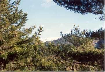 Color photo with an artistic view through tree branches to give a bird's eye view of snow on Mt. Tamalpais in the distance. Sky is blue with a few wisps of clouds..Collection