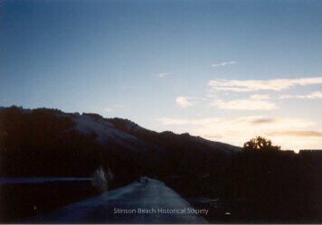 A print in color of a road with snow accumulation. Part of a fence shows in the left foreground and it and the surrounding shrubs and a distant tree do not appear to have kept the snow. Apparently a scene taken at dusk with traces of a sunset with scattered clouds at the above right..Collection