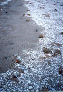 This picture is in blue and white tones and shows a sandy beach with the waterline at the upper right.. In the center of the picture from top to bottom can be seen the wave line in the sand. To the right of it are many scattered rocks dotted with snow.Collection