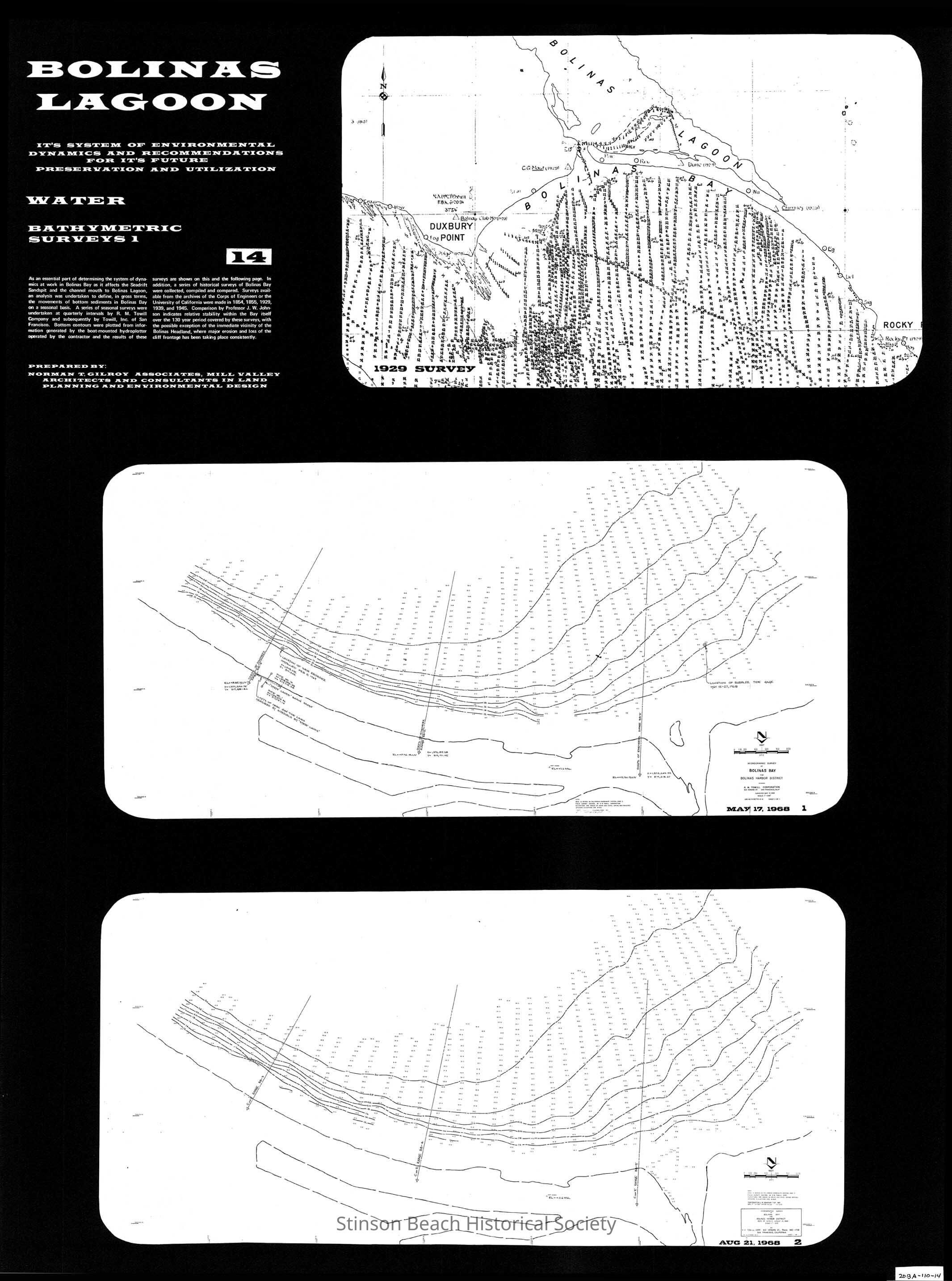Three bathymetric (bottom sediment) studies of Bolinas Lagoon to define movement on a seasonal basis. Studies undertaken by R. M. Towill of San Francisco in 1968. Previous study shown was compiled by Corps of Engineers in 1929.