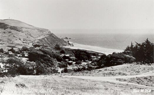 A portion of Bolinas Bay and the village of Stinson Beach appear in this black and white photographic print (made from a postcard). In the foreground of the panoramic view is rocky, unimproved land crossed by the intersection of two dirt roads. In the middle right are trees and a large boulder; at the upper left Highway 1 winds down into the village. At least 15 structures are visible among the trees in the wooded area lower down.Collection