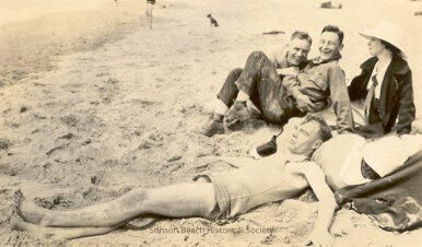 This is a fading sepia print showing 4 people relaxing on the beach. In the foreground is a man iin a bathing suit lying on his back with his head resting on a blanket and towels. Behind him are two men in street clothes, half sitting and half lying with big smiles on their faces. Beside them is sitting a lady wearing a dark jacket and white hat.Collection