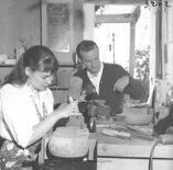 This black and white image is very similar to #1994-130 except the woman is looking down at her work and the man has shifted his position slightly.Collection