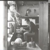 This black and white photograph is of a man(Gerry Olds) sitting at a small desk or table next to an upright piano. He is in profile facing left towards a window and is writing (music?). In the foreground is a table with some unrecognizable items on it (something round-- perhaps a big melon?).Collection
