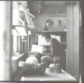 This black and white photo is almost identical to photos 1994-134 through 136 except Gerry Olds is not writing but turning the paper over hence the paper is visible, not flat on the desk.Collection