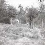 This black and white photograph shows three people working among the trees. The man closest to the camera is under a tree removing the lower branches. He is wearing dark clothing. He has removed most of the lower branches leaving a top portion shaped like a bushy small Christmas tree. There are two more trees visible that have been shaped in this way. Farther back and to the left are two more men in light clothing working among the trees. They are leaning over and working closer to the ground but its hard to see exactly what they are doing. The foreground is grassy. It appears to be bunch grass or perhaps low shrubs.Collection