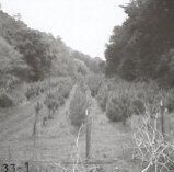 In this black and white photographic print a dirt farm road on the left side goes by lanes of trees, mostly of the same size and shape. In the foreground a barbwire fence runs along another dirt road.Collection