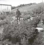 Black and white photographic print showing a man standing in the middle of a tree nursery with work clothes and cowboy hat. He carries two small cans containing fir trees and is walking along a path through the nursery with trees in the early stage of growth in larger containers. A structure of wood is in the background to the left and the hillside at the top of the picture is fenced in. Some trees are growing along the split rail fence in back of the man and at the top of the hill other trees are already established and growing.Collection