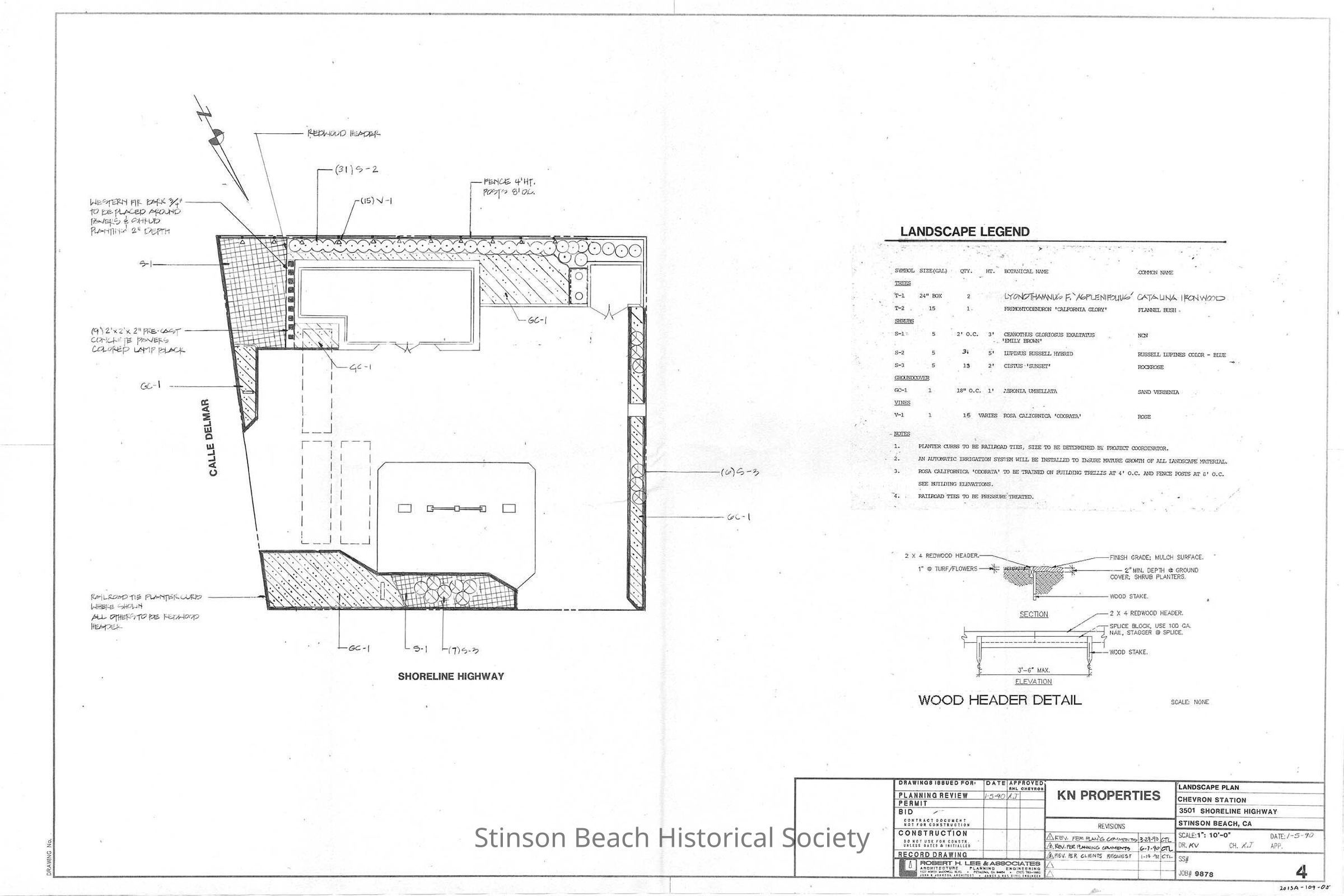 Landscape Plan for new Chevron Gas Station on Shoreline Hwy in Stinson Beach, includes Legend and Wood Header Detail.Collection