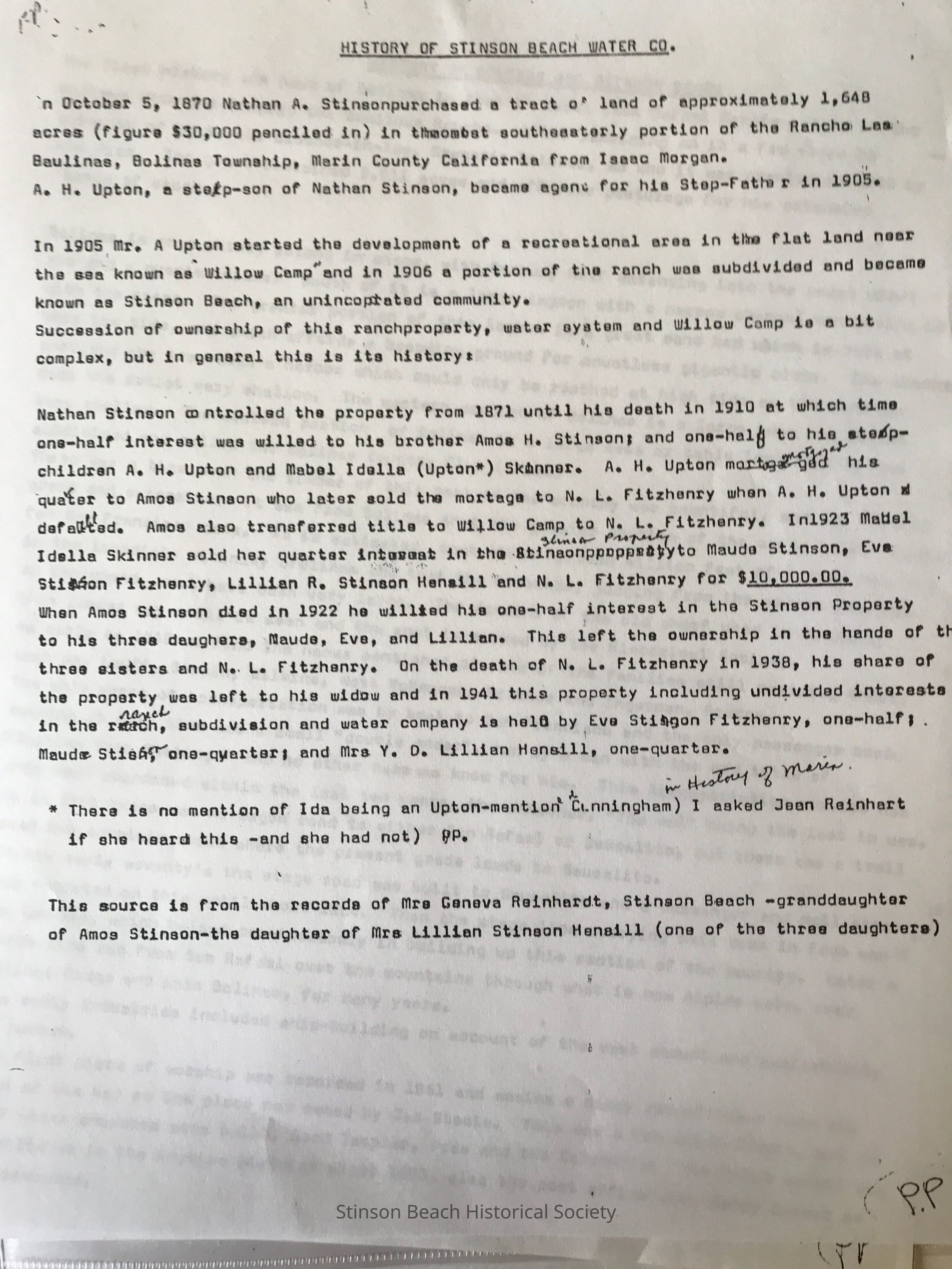 Geneva Reinhardt was granddaughter of Amos Stinson. She recounts the water issues, property owners and various disputes. one page