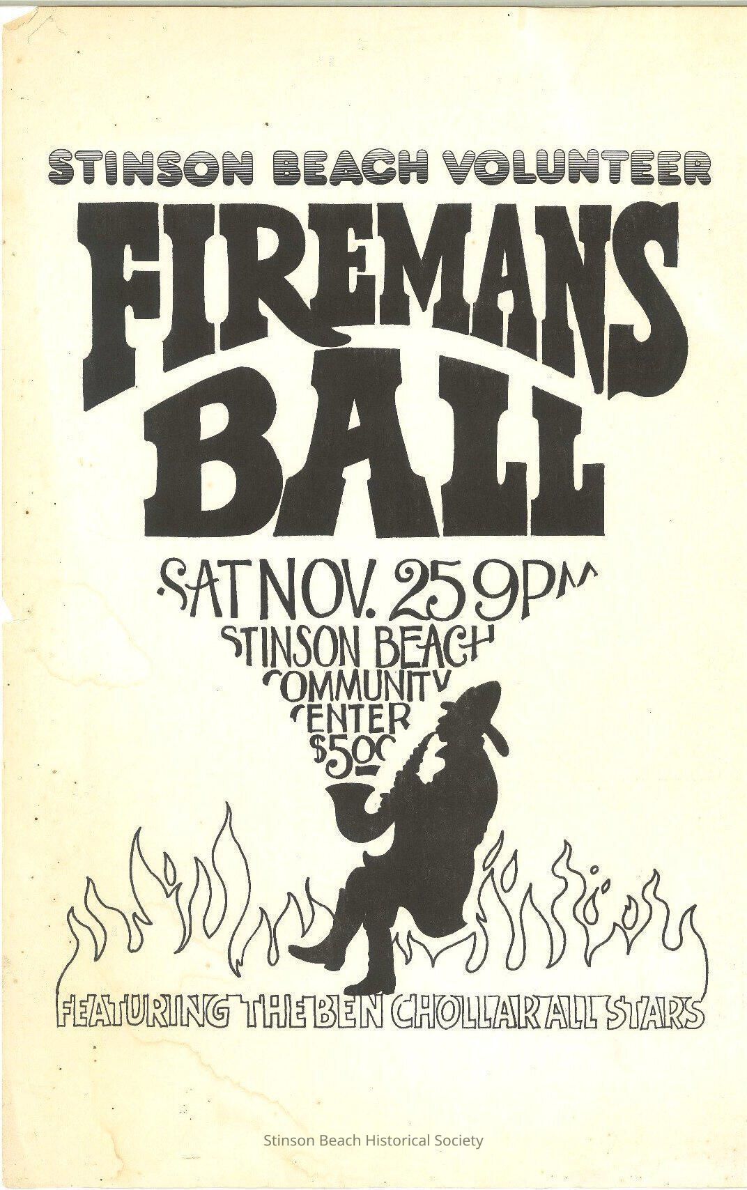 Uncredited poster advertising Fireman's Ball featuring the Ben Chollar All Stars. Graphic silhouette of old fashioned fireman playing a saxophone sitting in a sea of flames. Words rise out of sax like smoke...Collection