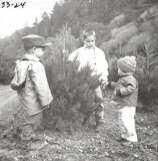 Essentially the same photo as previous (1994-161). Three young children examine a small fir tree at the base of a clearing on the Christmas Tree Farm on Hwy. 1. The biggest boy holds up the tree while the smallest child touches one of its branch and the middle child looks on.Collection