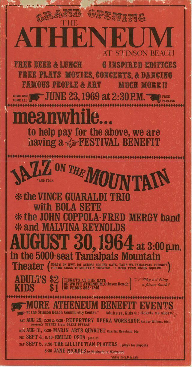 Poster in orange and black advertising Atheneum benefit concert in Stinson and a Jazz on the Mountain concert in the Mt Tamalpais Theater.Collection