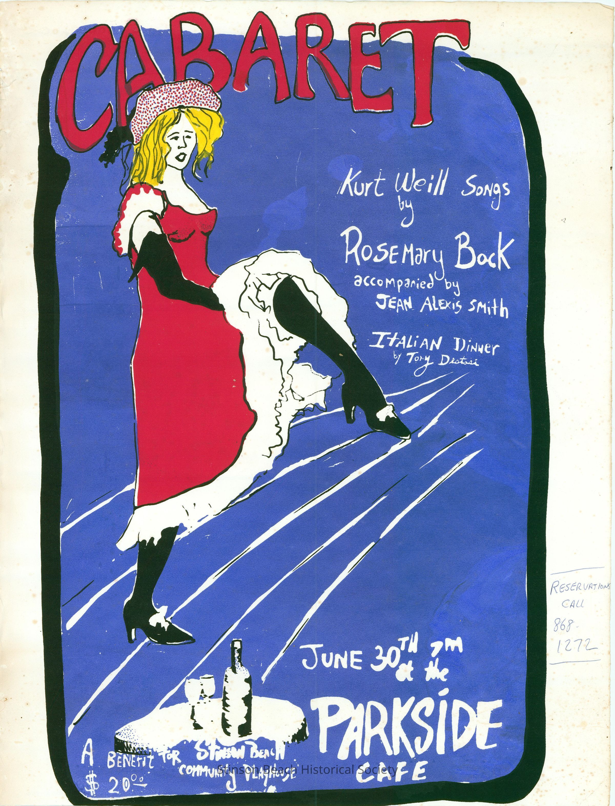 Color poster in blue, red and white advertising a production of Cabaret by Kurt Weill at the Parkside Cafe. Shows a full-length can-can dancer high-stepping with the words above her foot, plus a small graphic of a bottle of wine and 2 glasses on a tray in the bottom left corner.Collection