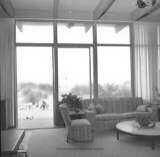 Interior view of living room which looks out through floor-to-ceiling window/sliding door onto the dunes, where there are children playing. A striped couch with its back to the window is flanked by an end table with a plant on it and a matching chair (without arms) to form an L. In front of the sofa is a low round table with a fern in a round bowl on it. Beamed ceiling.Collection