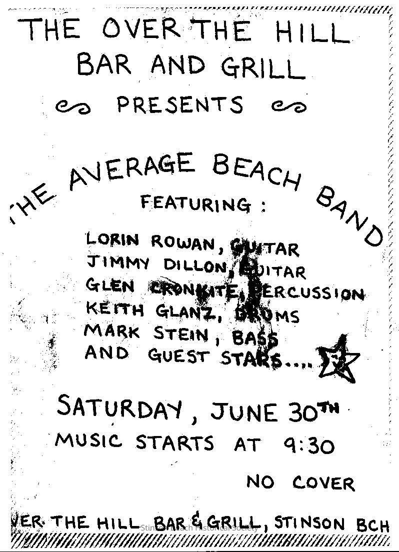 This is a copy of a flyer or poster of a performance by The Average Beach Band held at Over The Hill Bar and Grill, the building which is presently the SBCWD building. It was held on Saturday, June 30th of mid 1970s.Collection