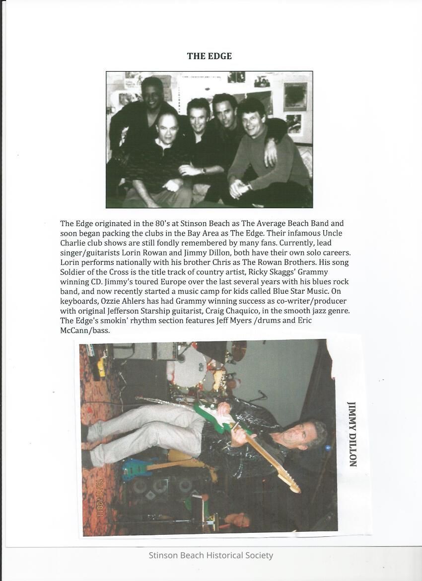 This is a short history of The Edge, a band mostly based in Stinson Beach in the 1980s, with photos. Lists members involved in the band.Collection