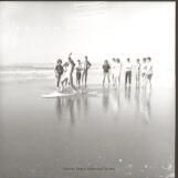 This black and white photograph shows eleven children standing in a row on the flat wet sand with their backs to the ocean watching a boy jumping onto a skid board in front of them.Collection