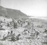 Stinson Beach full of people, mostly young, sitting, laying and standing on the sand as the beach rises towards the dunes. The cliffs are visible in the background.Collection