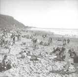 Scene similar to the previous (1994-186) with the exception being a little bit more of the ocean is visible. There a number of people scattered along the beach, some sitting in groups, some standing, etc.Collection
