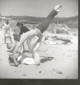 Black and white photographic print shows 5 girls on the Seadrift portion of Stinson Beach. Sea grass shows in the background where behind are at least two roofs visible. Four of the young women are doing acrobatic stunts while a third, in a casual dress, watches them. Beach towels are spread on the sand to the right rear of the photo.Collection