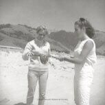See #1994-192-01. This is a black and white photo of the same two girls in a similar pose but the blonde is now facing the camera and the dark haired girl is turned toward the left.Collection