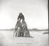 This black and white photograph shows six girls kneeling on eachother's backs forming a pyramid with three on the bottom, then two and then one on top.Collection