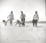 This black and white photo shows three pairs of girls doing the 'wheelbarrow' in which one girl is walking on her hands while her feet are being held by her standing partner as if they were handles to a wheelbarrow. They are on the beach.Collection