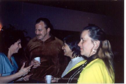 Color print of slide taken at a party possibly the baby shower for Dr Carol Flynn who was married to Dr George Flynn at that time. Grace Marie Nielson is talking to George. Carol, Barbara Bowen at right.Collection