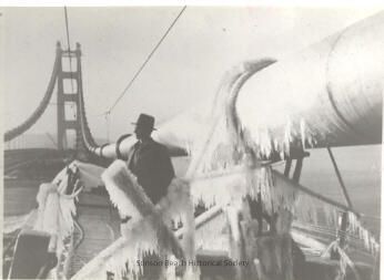 The Golden Gate bridge under the construction. The tower is in the background with the cables holding it up. The ropes and construction material in front is frozen with icecles hanging. A man in his hat stands in the midst of them.Collection
