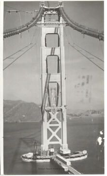 A Black and white photograph of the Golden Gate Bridge under the construction. The tower is on the center of the photo and cables are being woven in.Collection