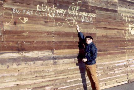 A print made from color slide. The slide shows Otto Reutinger standing in front of Col. White's wooden sea wall with his hand reaching up to show the level of sand erosion. The sea wall at the end of Calle del Embarcadero was replaced by concrete one after and during the storms of 1982-83.Collection