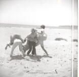 This black and white photograph shows six girls in various stages of piggyback (ie. on piggyback, or falling off or fallen off). They are on the beach.Collection