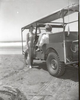 This black and white photograph shows an open beach vehicle from the back. It is on the sand facing the surf and has a rack overhead with a surfboard on it. There is a man seated in the driver's seat facing the ocean and a woman in a bathing suir is standing by the front wheel facing the driver.Collection
