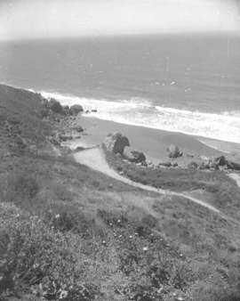 This black and white photograph is a view of the south end of the beach from the cliff above. The foreground is shrubby and shows a path leading from right to left where it drops out of sight . The beach surrounded by boulders is directly below the path with the surf and ocean beyond.Collection