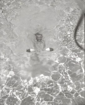 This black and white photograph depicts and child in the water holding onto a flotation device consisting a hold bar with a bulb shaped float at each end. The picture is taken from above looking down on the child showing his head and arms, the rest of his body being underwater.Collection