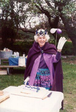 Photo of Peggy Pepper at her farewell party in Stinson Beach Park is similar to the previous. The only difference being here she is waving one white-gloved hand and facing foreward as she stands behind the table with her cake on it.Collection