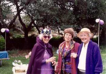 This colored photograph shows Peggy Pepper in her purple cape, blouse, sun glasses and crown standing next to Marion Weber dressed in a purple blouse under a deep pink jacket and a floral scarf around her neck. Next to Marion, to the right, is Barbara Pace who is wearing a white top under a deep purplish-blue sweater. She is wearing an off white brimmed hat and clear glasses. All three women are smiling at the camera and Peggy and Barbara are holding drink glasses. There are trees in the background and the end of a table with a blue cover is visible on the left. The tables are decorated with purple and white balloons on a stick and two of these are visible to the right and left of the group.Collection