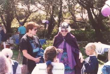 This color photo shows Peggy pepper in her purple finery and crown surrounded by unidentified partygoers. To her right is a woman with short red hair and sunglasses wearing a black t shirt with a design on the front. She is looking at Peggy. In front of Peggy with her back to the camera is a woman in a white blouse and brown hair done in a french braid with the end secured by a blue scrunchy. To Peggy's left is a little girl with blonde pigtails in a navy sweat shirt. There are some people partially depicted in the left background and foreground and purple and white balloons visible behind Peggy and in the right upper corner. There are trees in the background.Collection